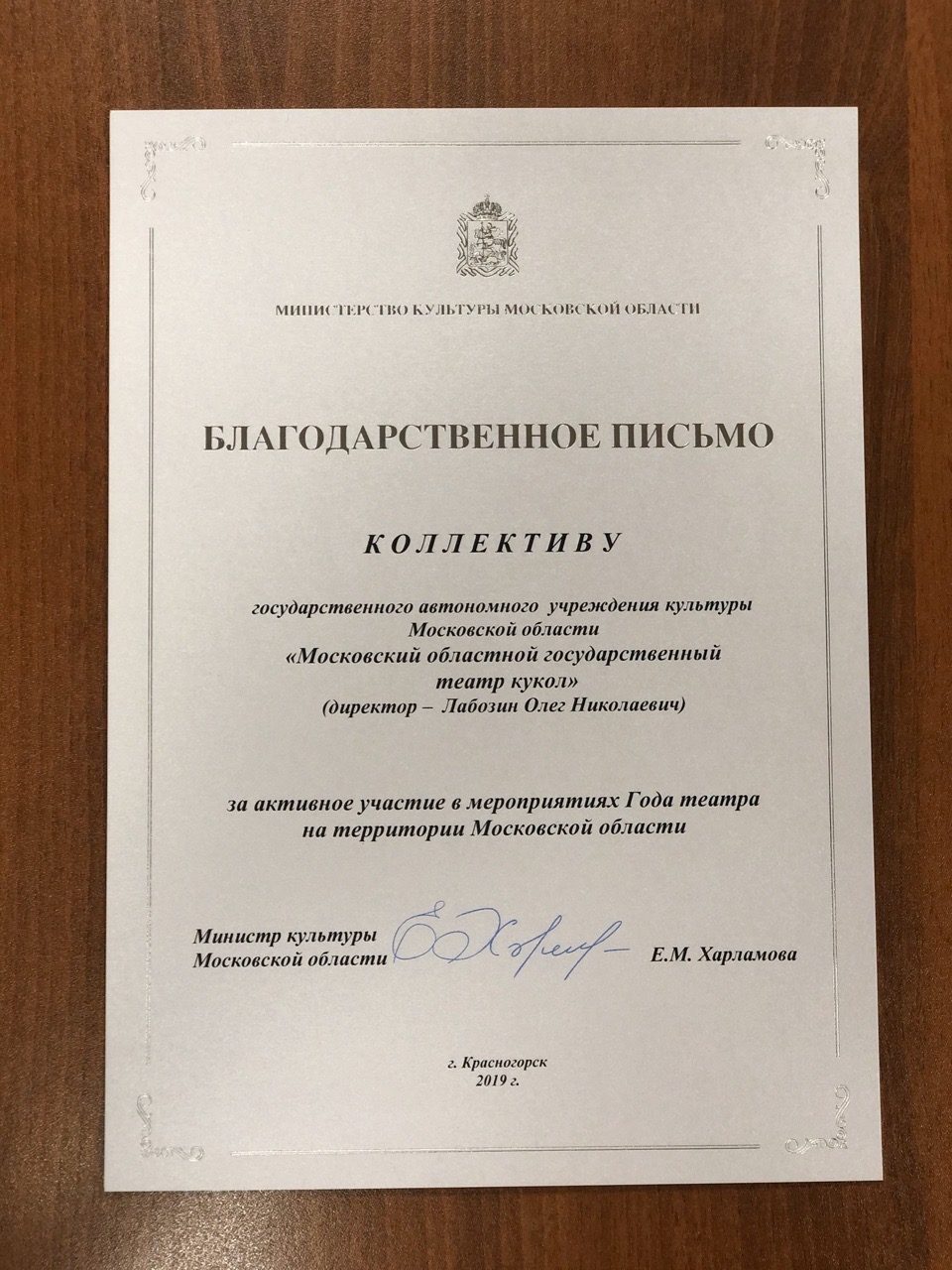 выразило благодарность за активное участие МОСКОВСКОГО ОБЛАСТНОГО ГОСУДАРСТВЕННОГО ТЕАТРА КУКОЛ  в мероприятиях в ГОД ТЕАТРА на территории Московской области.